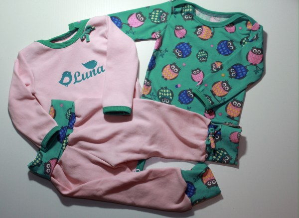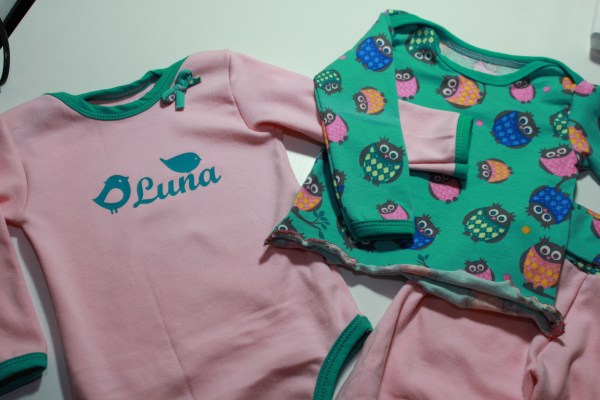 Entstanden sind ein Baby-Shirt (Klimperklein), ein Regenbogen-Body (Schnabelina) und eine Pumphose (eigener Schnitt) in Größe 62. Ist das mini, aber so süß! 🙂