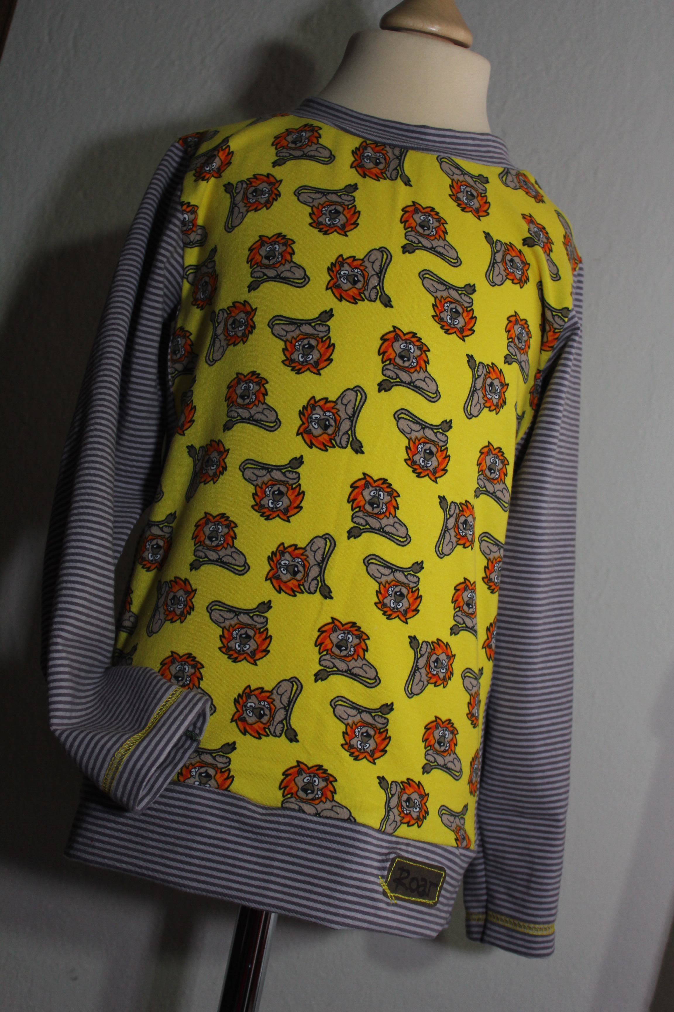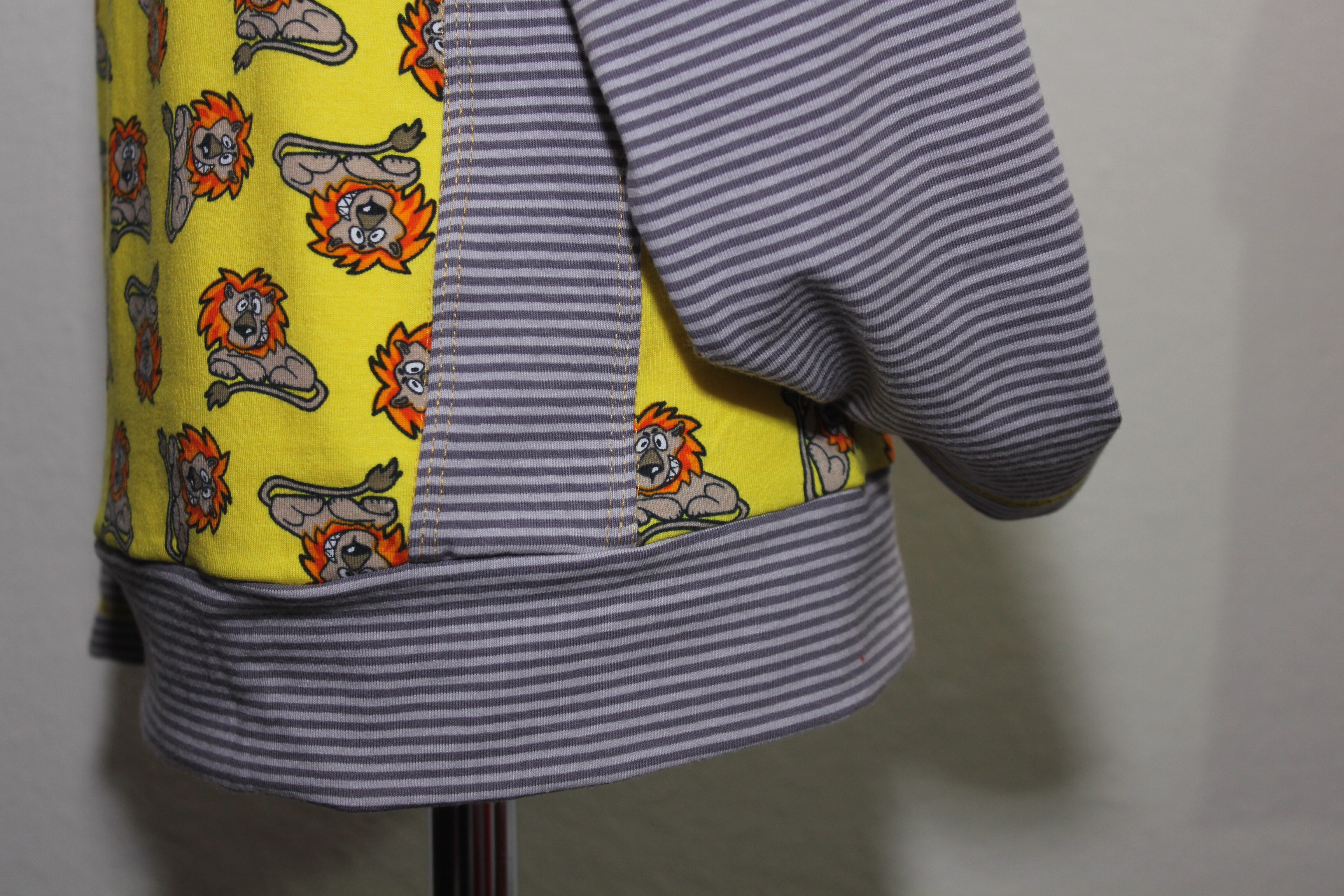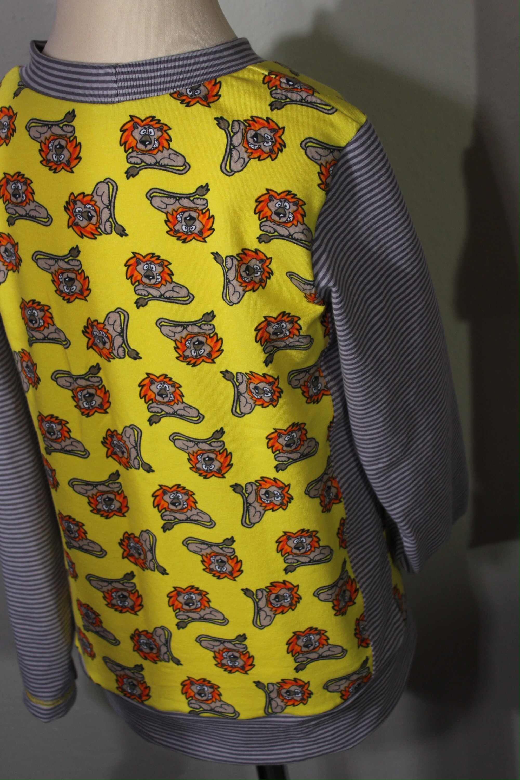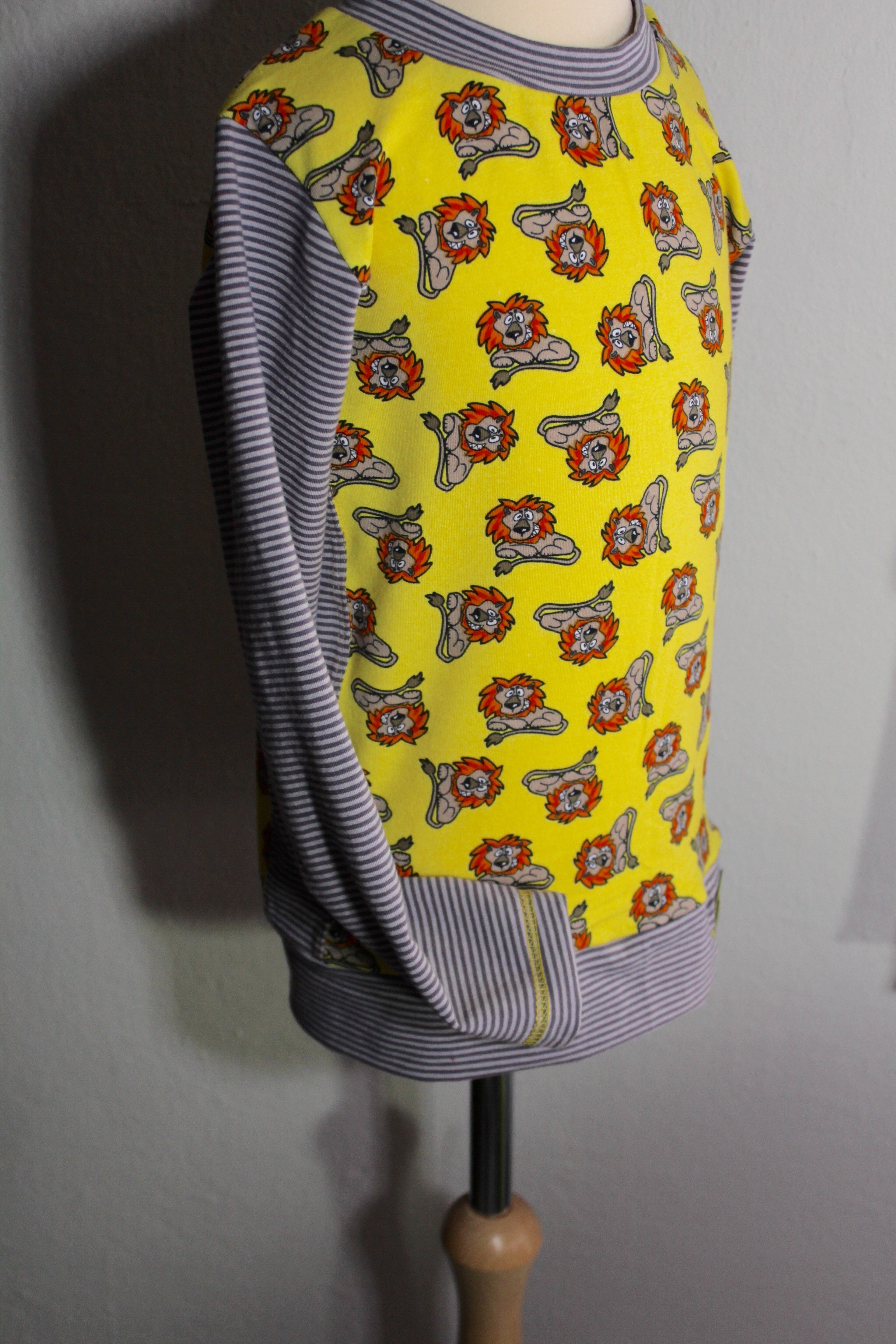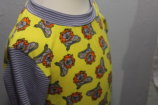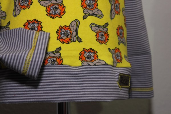 Ich habe besonders viele tolle gemusterte Stoffe, die ich ohne Plan gekauft habe, weil sie mir einfach gut gefallen haben. Die lassen sich mitunter schlecht kombinieren. Oder es gab sie im Sale, manchmal waren es Restposten, wie zum Beispiel die gelben Löwen. Davon hatte ich nur einen halben Meter, das reicht ja mittlerweile weder für ein komplettes Shirt noch für eine Hose für die Jungs.