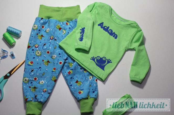 Dazu ein hellgrünes Babyshirt aus Sanetta-Jersey. Den Frosch habe ich bei Pinterest gefunden, und die Schriftart gibts hier zum Download für private Verwendung: Gretoon. Tipps und Tricks zum Plotten mit Flex-Folie findet ihr heute auch bei Claudia im Blog: Blaues-E-Kreativ.