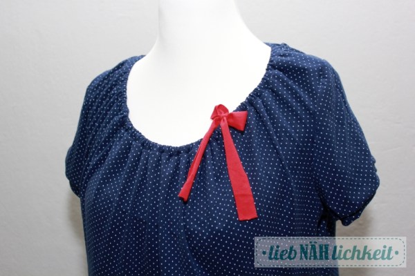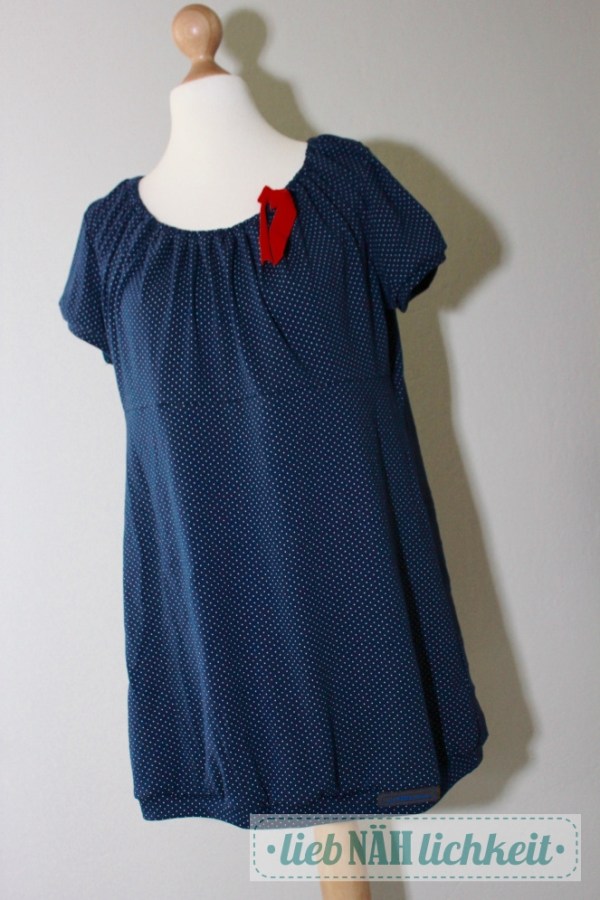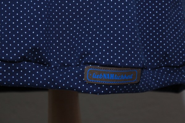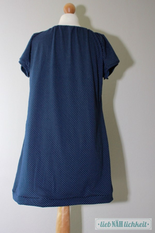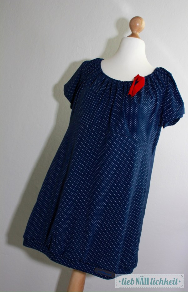 Genäht habe ich als Geschenk ein Sommerkleid aus leichtem marinefarbenem Pünktchen-Jersey von Sanetta, nach dem Schnitt „Ferrara“.
