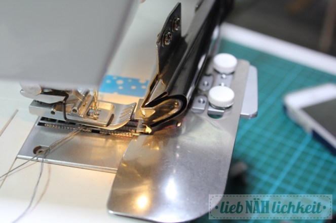 Durch die ganz glatte Oberfläche hat man die Möglichkeit, das Zubehör, wie hier den Bandeinfasser, bis ganz an den Nähfuß ranzuschieben, wenn man das möchte.
