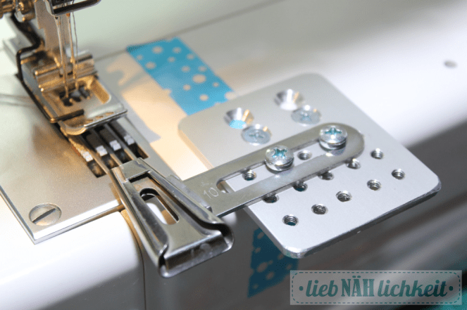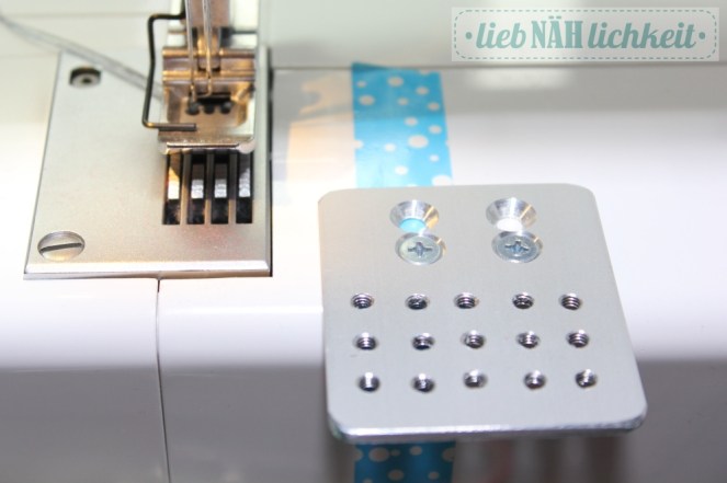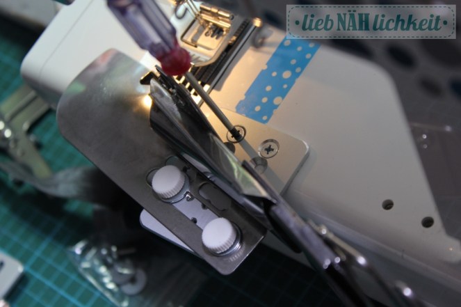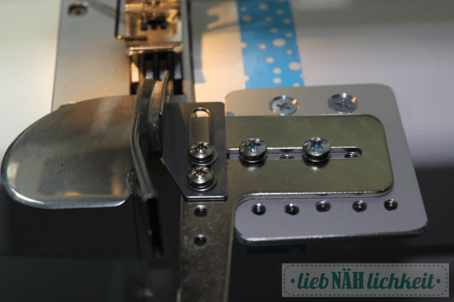Ich habe ja keine Lust, den Bandeinfasser immer neu zu justieren und viel Probe zu nähen. Deswegen belasse ich meist (soweit möglich) die Zubehörteile an den Grundplatten. Die schraubt man ran und los gehts.