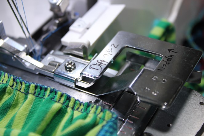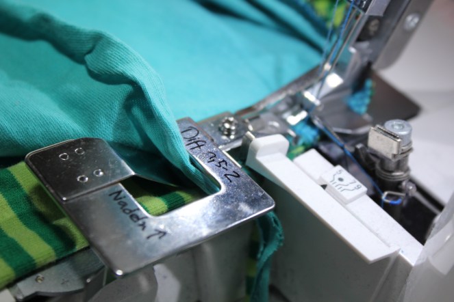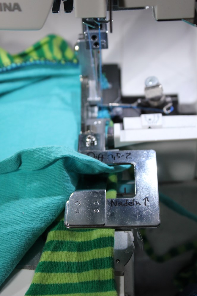 Der Kräuselfuß sorgt dafür, dass die beiden Stofflagen getrennt unter den Nähfuß geführt werden. somit wird erreicht, dass der untere Stoff gekräuselt wird und der obere glatt bleibt. Es wird empfohlen, die Nadelspannungen etwas zu erhöhen, das habe ich mir direkt auf dem Füßchen notiert, um es nicht zu vergessen.