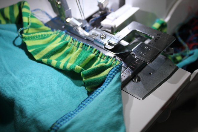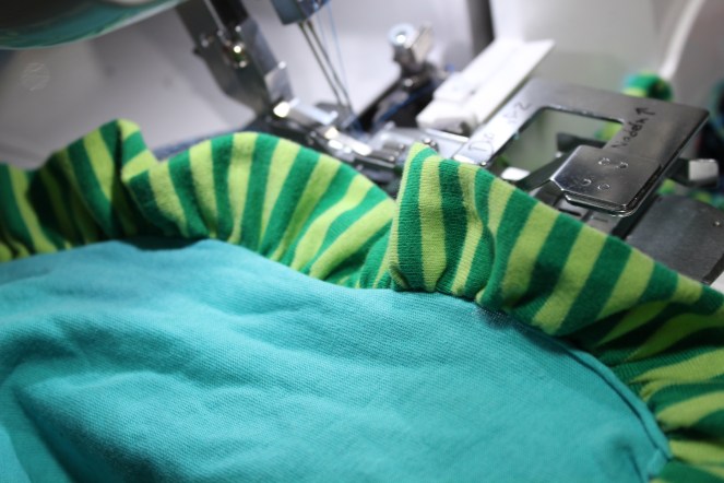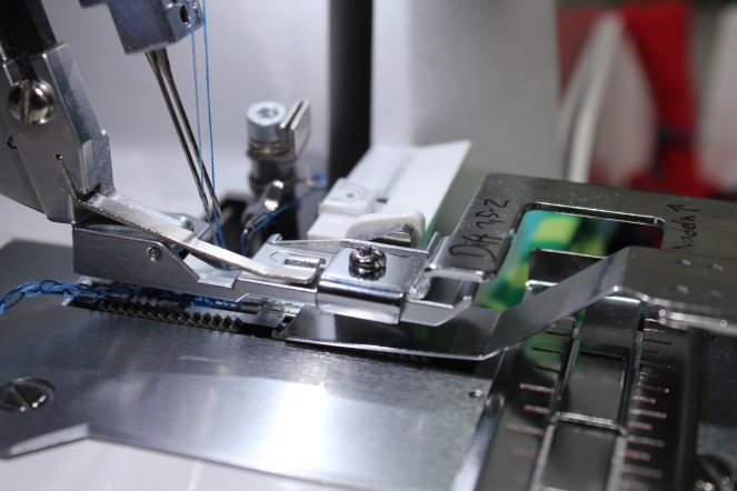 Die Geschwindigkeit des vorderen Transporteurs ist an der L460 (und übrigens auch allen anderen Overlock- und Covermaschinen) verstellbar. Stellt man das Differential höher als 1, wird der vordere Transporteur schneller, als der hintere, das heißt, es wird mehr Stoff „reintransportiert“, als rauskann, es entsteht ein Stau. Der untere Stoff kräuselt sich.