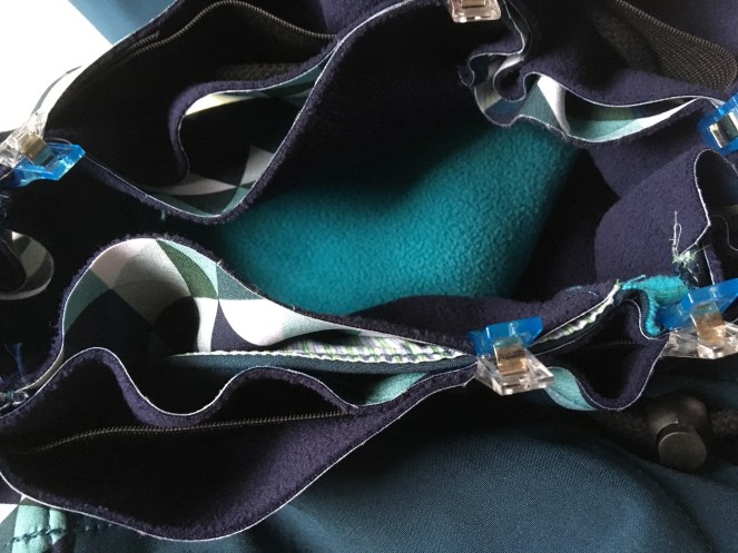 Hier könnt ihr es sehen: ich habe oben eine Lage Softsshell, dann die Tasche (eine Lage Softshell und eine Lage Popeline als Futterstoff) und dann kommen nochmal zwei Lagen Softshell, worin ich den Gummi für den Saum eingelegt habe, macht 5 Lagen dicken Stoff.