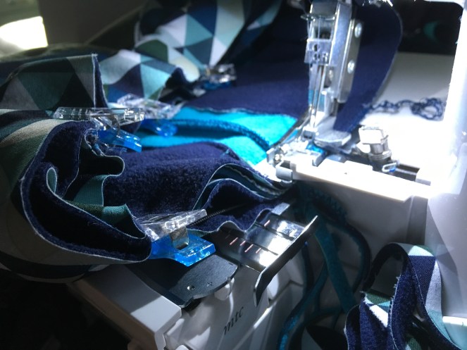 Weil ich gerne saubere Innenkanten habe, nähe ich gern alles erstmal mit der Overlock zusammen. Ja, darüber lässt sich streiten, ob das Sinn macht. Softshell müsste man prinzipiell gar nicht versäubern, dennoch sieht es einfach ordentlicher aus. Also hab ich die Bernina L460 gestartet und losgelegt.