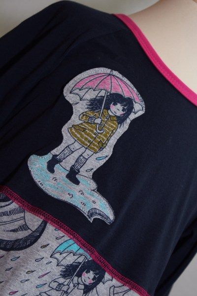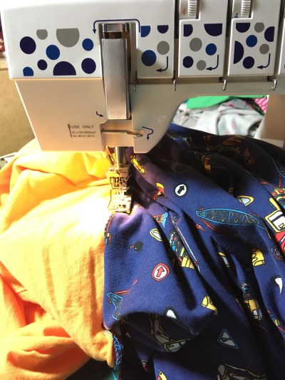 Da braucht man dann schon manchmal echt etwas Phantasie, wie die Jerseystücke zusammen dann an einem Shirt schön aussehen. Eine einfache Variante, die ich ausprobiert habe: ich habe zwei Jerseystücke auf der vollen Breite an der geraden Kante mit der Overlock zusammengenäht und dann die Naht direkt mit der Cover abgesteppt.