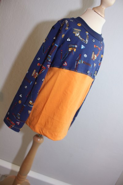 Im Dezember sind aber einige Weihnachtsgeschenke entstanden, die ich euch nun nach und nach hier zeigen möchte. Bei der Stoff- und Schnittauswahl bin ich dabei immer wieder an Grenzen gestoßen: Stoff reicht nicht mehr für den Schnitt. Ab Größe 122, die die meisten Kinder bei uns jetzt haben, ist es nämlich absolut vorbei mit einem halben Meter Jersey, selbst auf volle Breite gesehen. Und trotzdem platzt der Stoffschrank gefühlt aus alle Nähten und ich weigere mich, neuen Stoff zu kaufen in Anbetracht dieser Tatsache. Dann hilft also nur noch Stückeln und Kombinieren von unterschiedlichen Stücken.